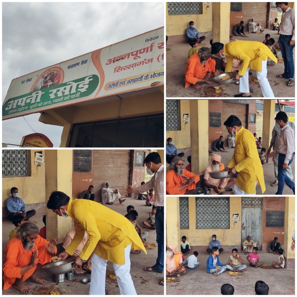 फ़िरोज़ाबाद– लॉक डाउन में निरंतर अपनी रसोई गरीब जरूरतमंद लोगों को करा रही भोजन एवं अपनी रसोई के वॉलिंटियर घर घर तक पहुंचा रहे भोजन के पैकेट व राशन। सोशल डिस्टेंसिंग का रखा जा रहा बराबर ध्यान। चेयरमैन सिरसागंज सोनी शिवहरे कर रहे लोगों से घरों में रहने की अपील।कोरोना वायरस के संक्रमण से बचने के लिए जहां देश में लॉक डाउन लागू है। वही रोज तबके कमाने खाने वाले लोगों के लिए संकट बढ़ गया है।वही बराबर लोगों से घरों में रहने की अपील की जा रही है। इसी क्रम में सिरसागंज में पुराने बस स्टैंड पर स्थित अपनी रसोई लॉक डाउन से निरंतर गरीब जरूरतमंद लोगों को भोजन के पैकेट व राशन सामग्री घर-घर जाकर उपलब्ध करा रही है। वही सिरसागंज चेयरमैन सोनी शिवहरे भी गरीब जरूरतमंद लोगों को अपने हाथों से खाना परसकर खिला रहे हैं। साथ ही बराबर लोगों से सोशल डिस्टेंसिंग का ध्यान रखने की कहे रहे है और लोगों से घरों में रहने की अपील कर रहे है।